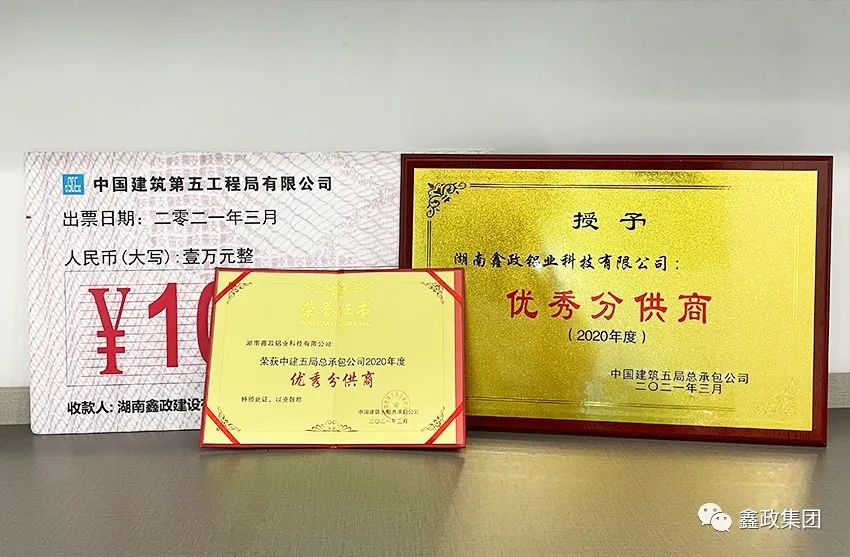 瀏覽次數:1516喜訊連連捷報傳。近日,在中建五局總承包公司2021年分包(供)商答謝會暨優秀分包(供)商表彰會上,集團下屬子公司湖南鑫政鋁業科技有限公司與湖南鑫政建設有限公司分別喜獲2020年度“優秀分供商”與“良好分包商”獎項。